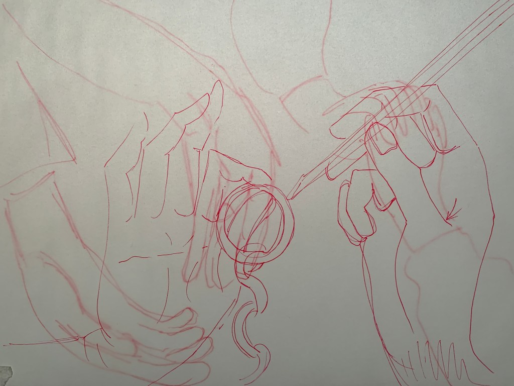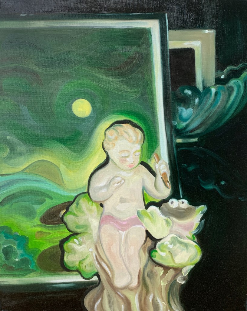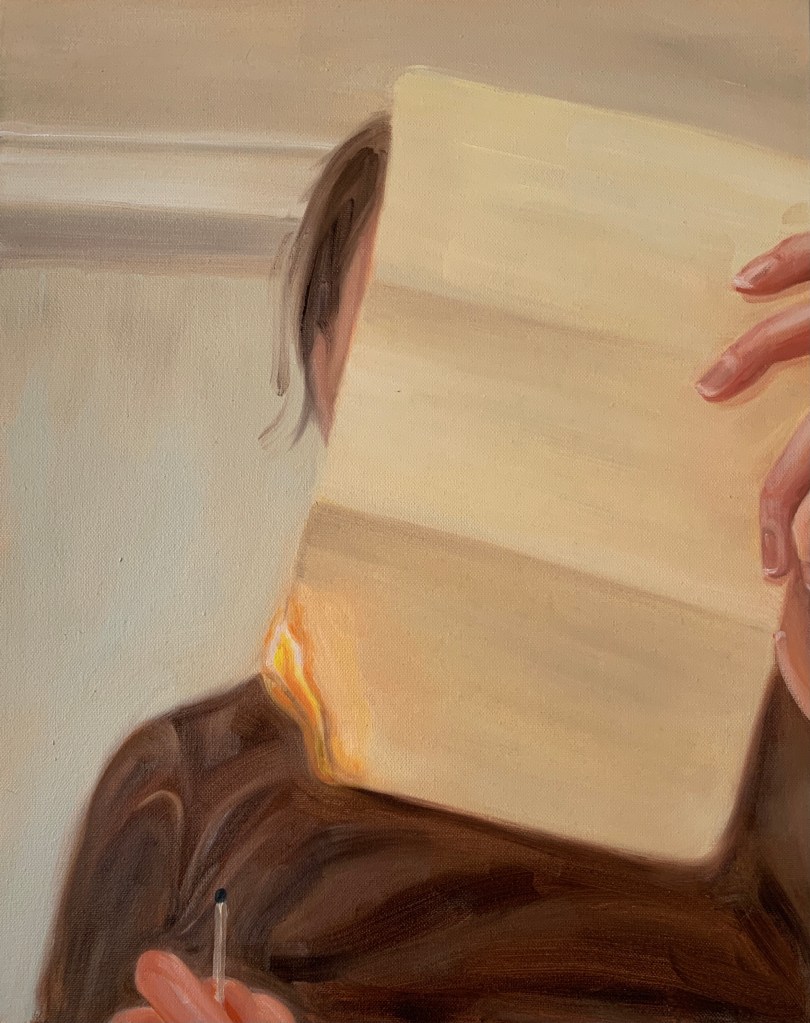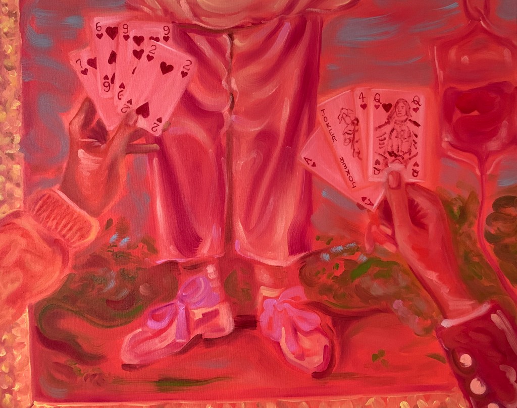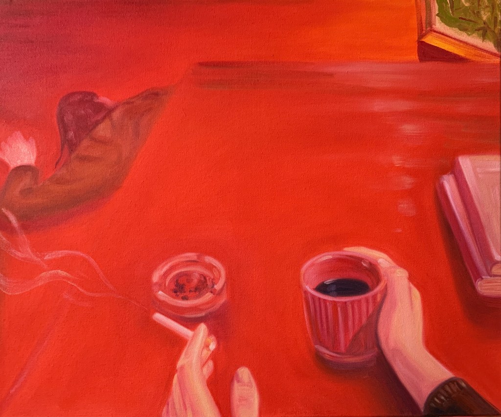 Pink Pierrot, oil on canvas, 30×24″, 2022Heroine chic, oil on canvas, 16×20″, 2022Where grass grows lush, oil on canvas, 16×20″, 2022, Kaylee next to window in st. a, gel plate print on paper, 9×12″, 2022Untitled, oil on canvas, 20×24″, 2022Caressing, oil on canvas, 16×20″, 2021sketchbook, mixed media on paper, 2021Untitled, mixed media on paper, 2021pen on transparent paper, 2021pen on transparent paper, 2021