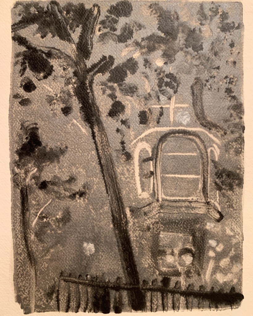 Walden Pond (2022, 9×12″, ink on gel plate)Kaylee next to window in st. a (2022, 9×12″, ink on gel plate)Bisecting tree (2022, 9×12″, ink on gel plate)Self Portrait (2022, 9×12″, ink on gel plate)Oysters and fork (2022, 9×12″, ink on gel plate)Booking (2022, 9×12″, ink on gel plate)Breakfast, Lunch, & Dinner (2020, 9×12″, ink on gel plate)Lost & Found (2020, 9×12″, ink on gel plate)