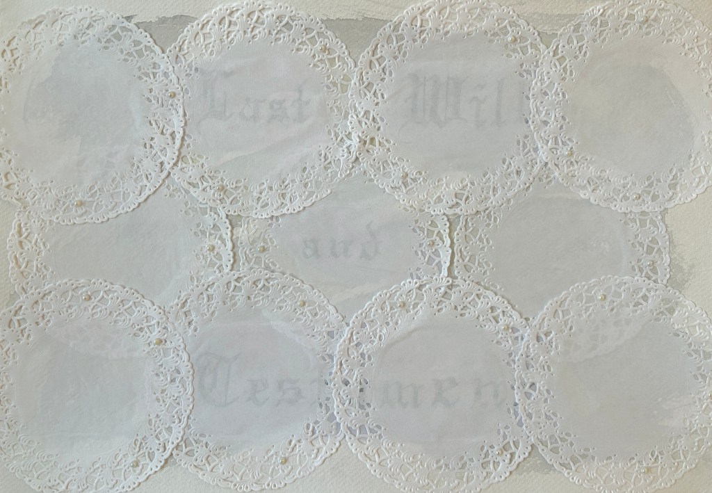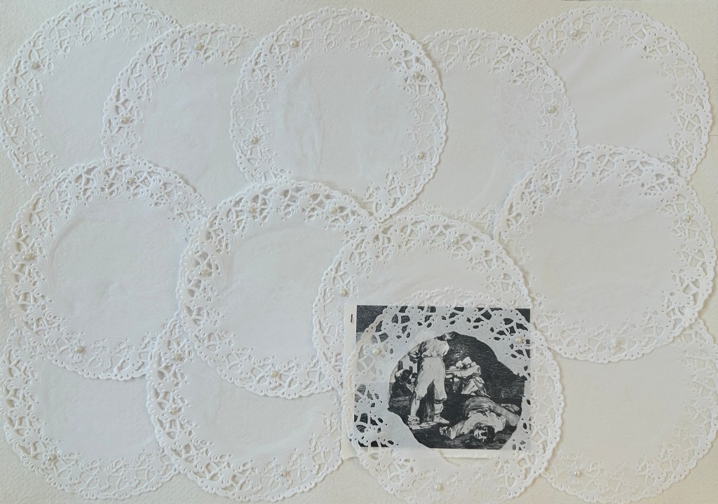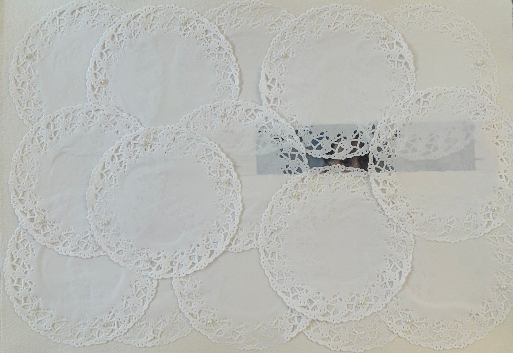 Doilies (Goya), paper doilies, printed image, pearls, and thread on paper, 29 x 42cm, 2026Doilies (Curtain Twitcher), paper doilies, printed image, pearls and thread on paper, 29 x 42cm, 2026Doilies (Last Will and Testament), paper doilies, pencil, watercolour, and pearls on paper, 29 x 42cm, 2026Childhood (unabridged), tracing paper, glitter, photograph, and masking tape on print, 28 x 41cm, 2024Um Um Da Da, photo, masking tape, and sheet music, 30 x 23cm, 2024O Sweet Briar, printed paper, coloured pencil, tracing paper, sheet music, and masking tape on photograph, 36 x 28cm, 2024